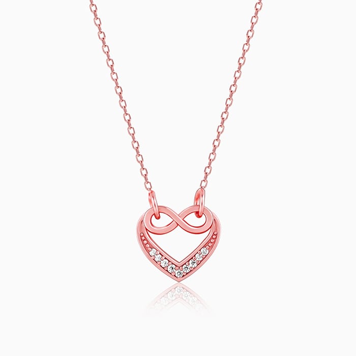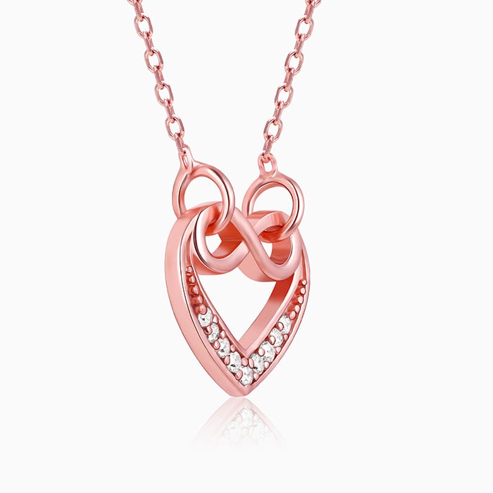 The rose gold necklace features a heart design with an infinite symbol on the curvature of the heart.