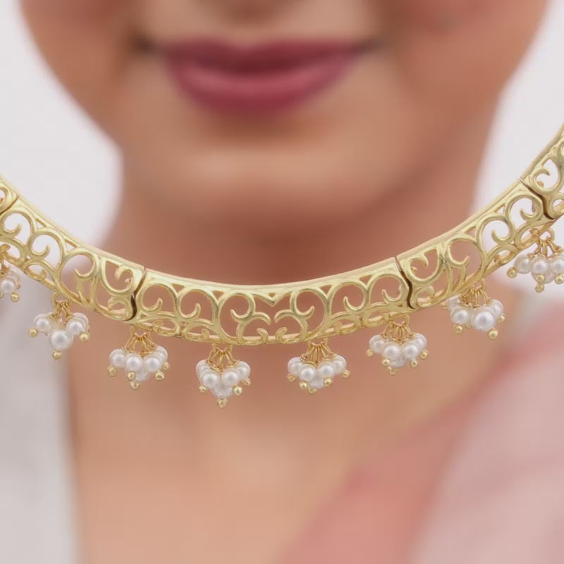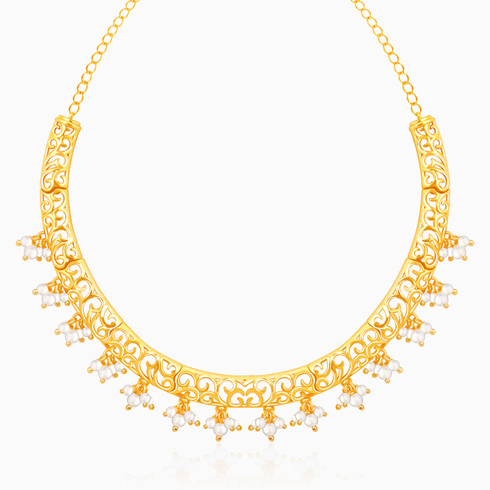 This golden necklace has a very unique design with pearls. Presenting GIVA's chic #VivaahDaSwag Collection for an unforgettable wedding.
