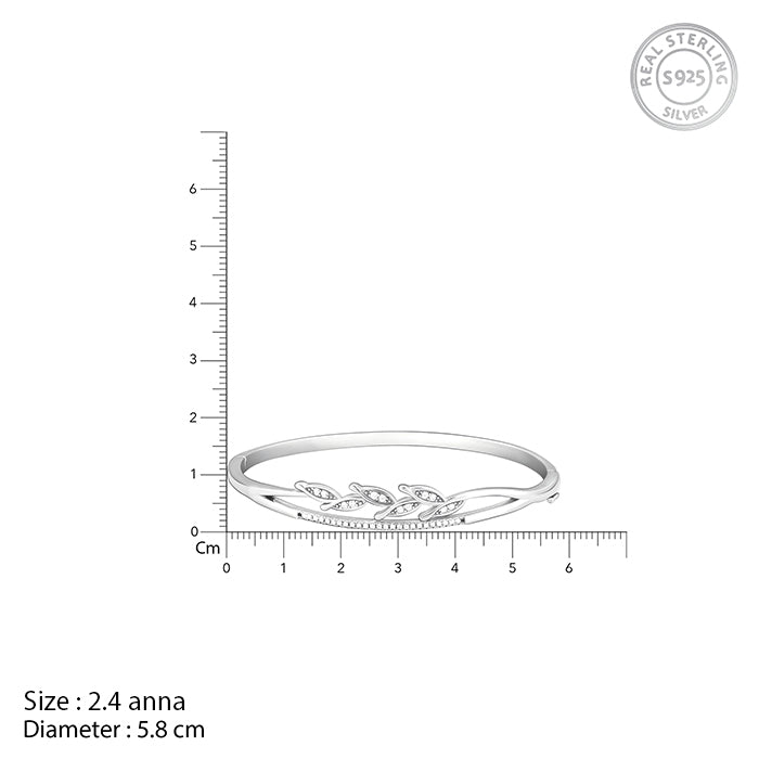 The silver bangle bracelet has a gorgeous centrepiece with a leaf design studded with zircons.
