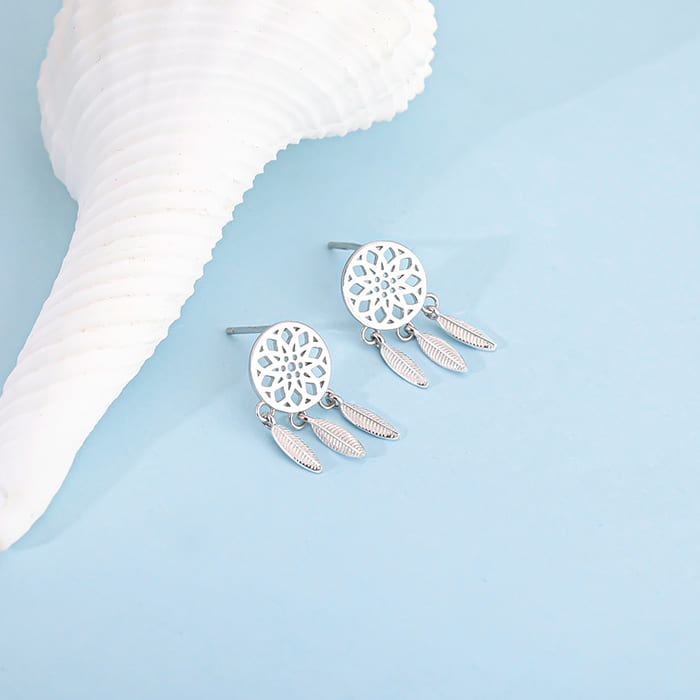 The silver earrings have a dreamcatcher design with feather like shapes dangling from it.