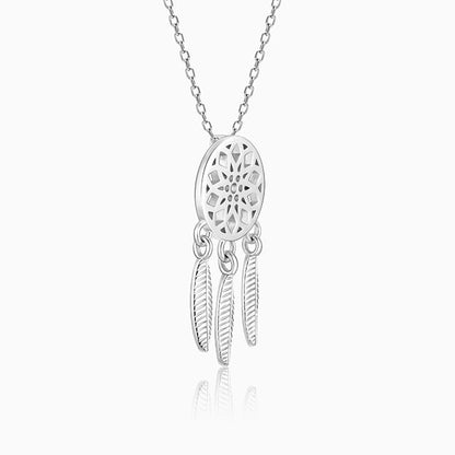 The silver necklace has a dreamcatcher design with feather-like shapes dangling from it.