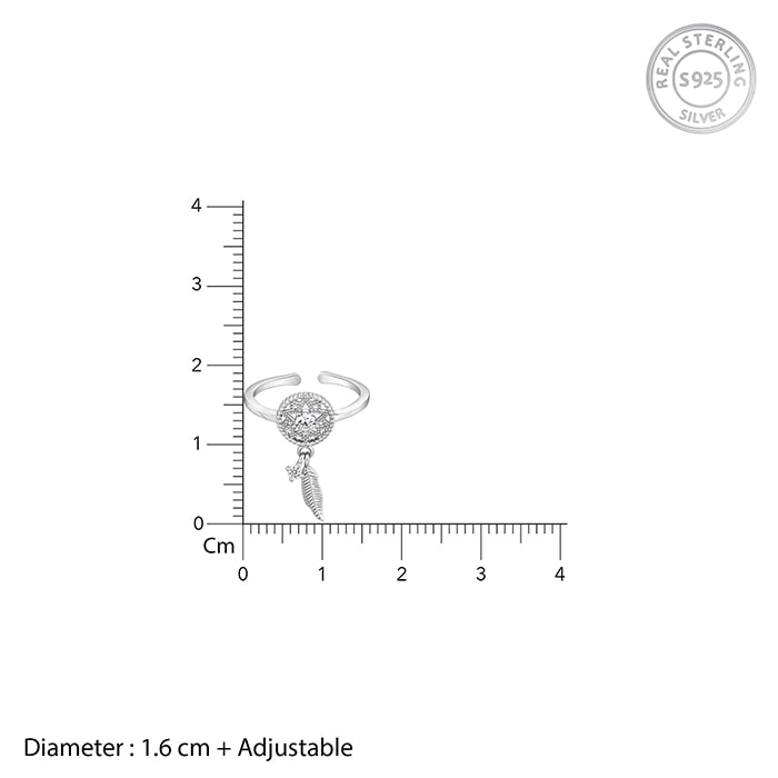 The silver ring has a dreamcatcher design with feather like shapes dangling from it.