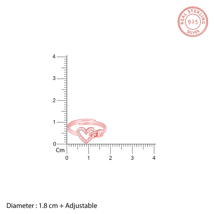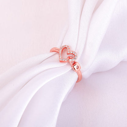 The rose gold ring features a hollow heart design studded with zircons and a lock on the side.