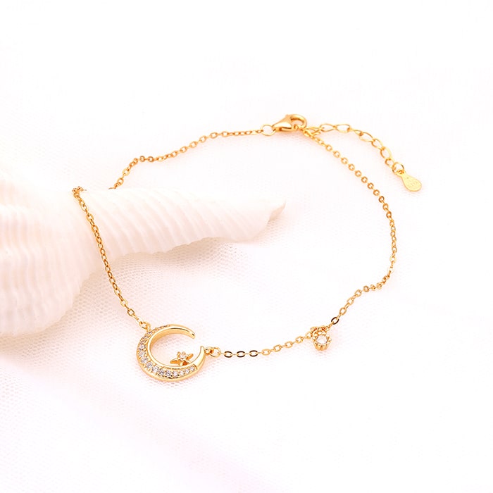 The golden anklet has a gorgeous crescent moon with a star on the bottom. The whole charm is studded with zircons.