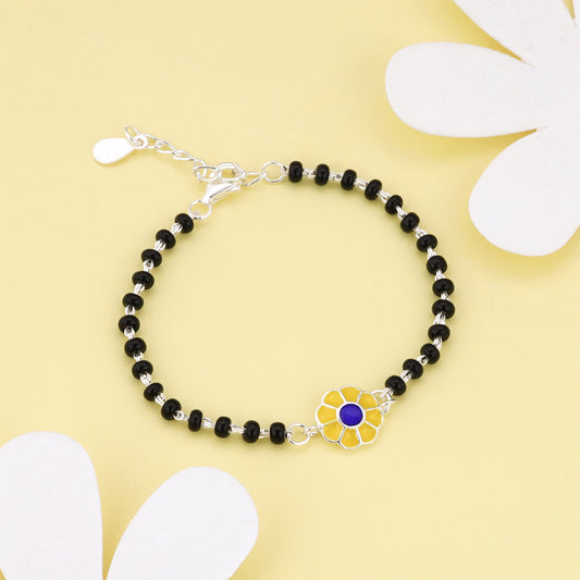 The silver kids' bracelet has an enamel yellow flower charm with a blue centre on it.