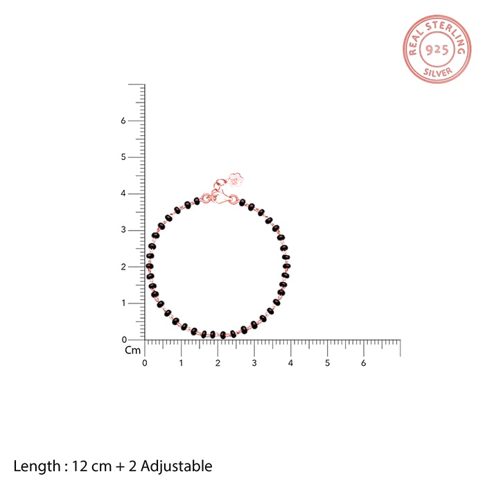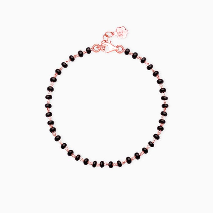 The Rose gold bracelet has black beads on a rose gold chain with a lobster claw clasp closure.