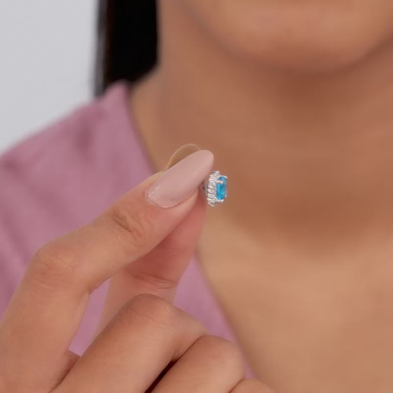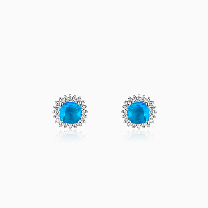 These silver earrings feature a square motif with blue-coloured zircon at the centre and zircon studded around.