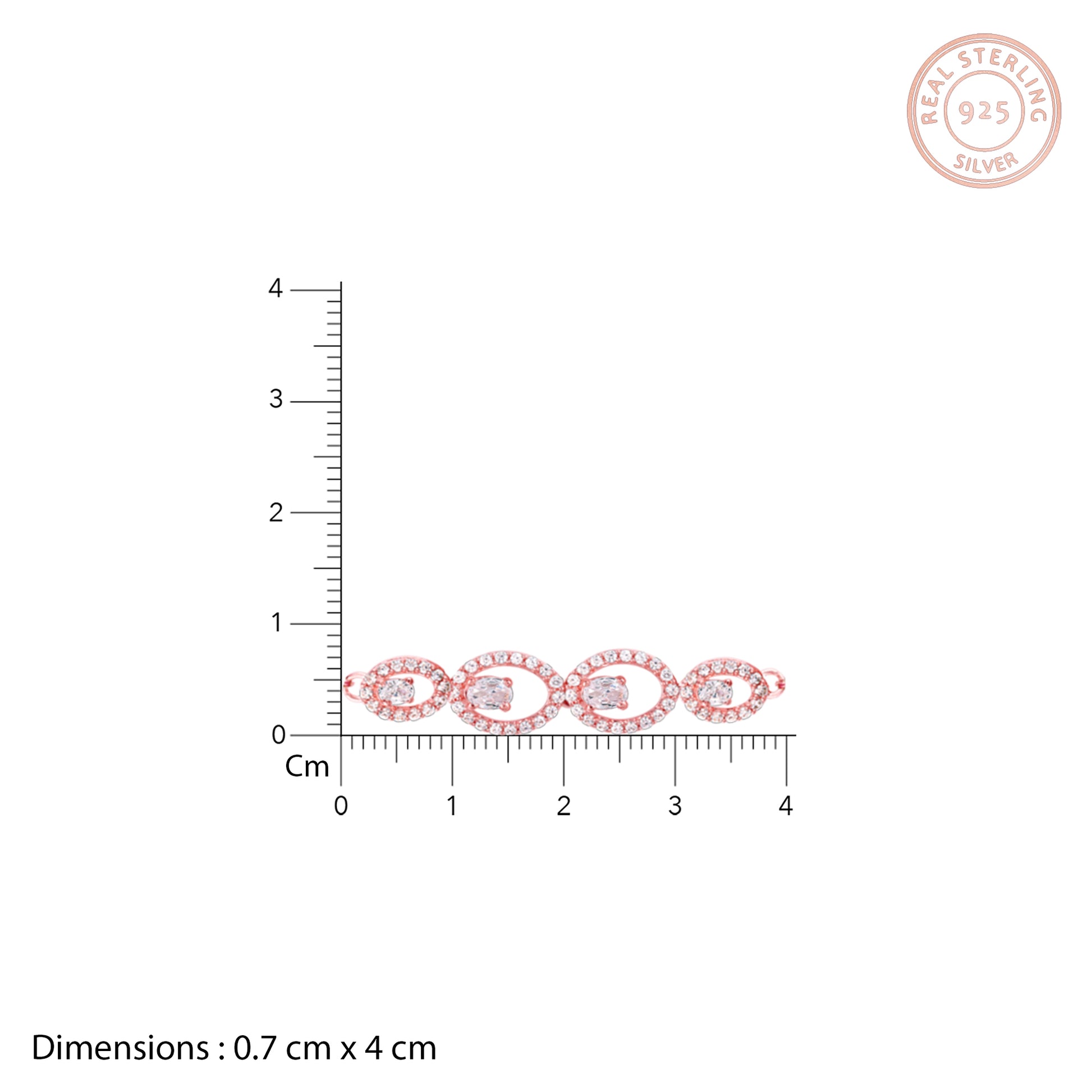 The rose gold mangalsutra has 4 oval-shaped charms with zircon stones inside it, in the centre with black beads around it forming the mangalsutra chain.