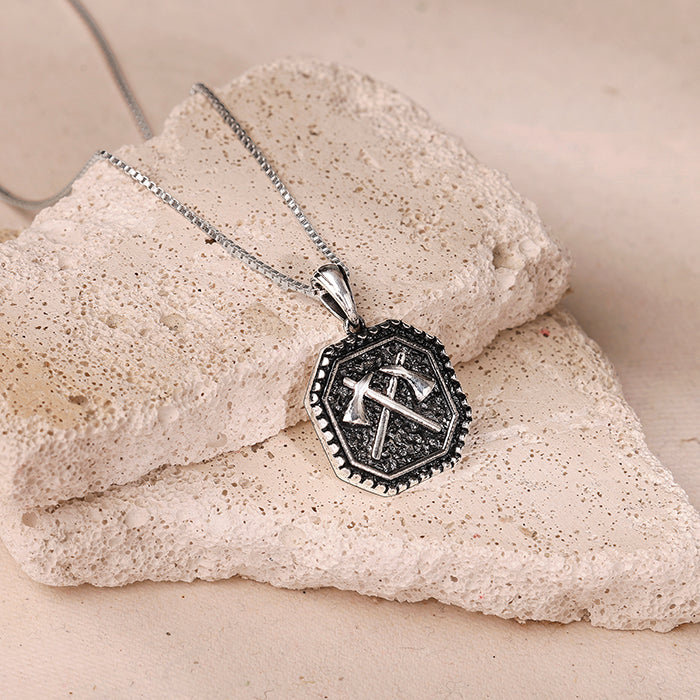 This oxidised silver mens pendant features crossed battle axes etched in bold relief. Rugged texture meets sharp design and comes with a box chain.