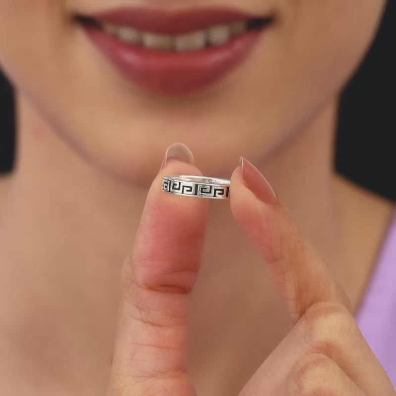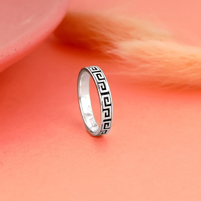 This oxidised silver ring features an Aztec symbol engraved in the band.