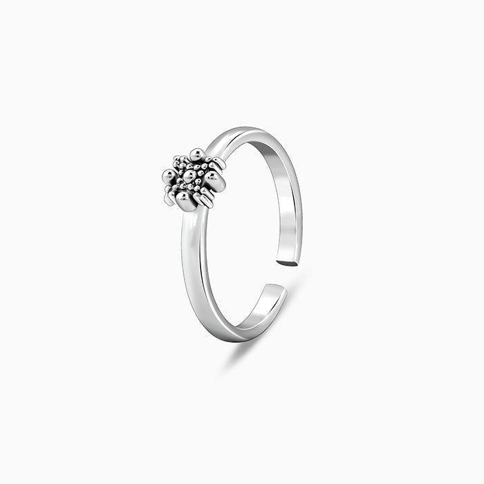 These oxidised silver toe rings for women feature a flower motif studded with zircons.