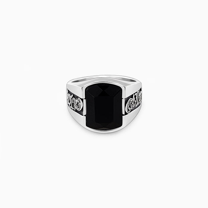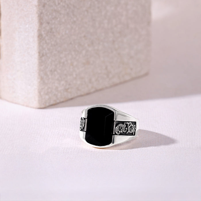 This oxidised silver mens ring features a rectangular black coloured stone at the centre. On both sides of the band, there are intricate engravings with a swirling pattern.