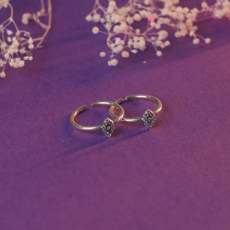 These oxidised silver toe rings for women feature an adjustable design with an evil eye motif studded with zircons.