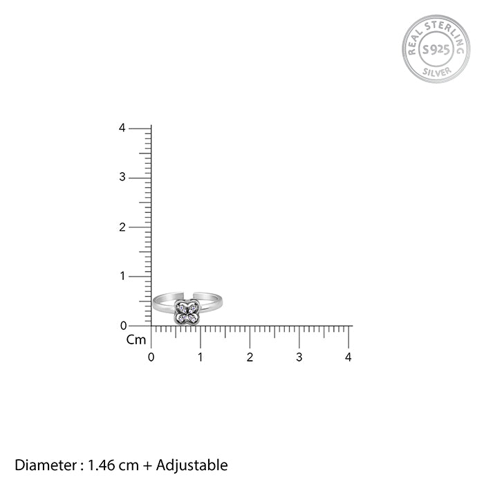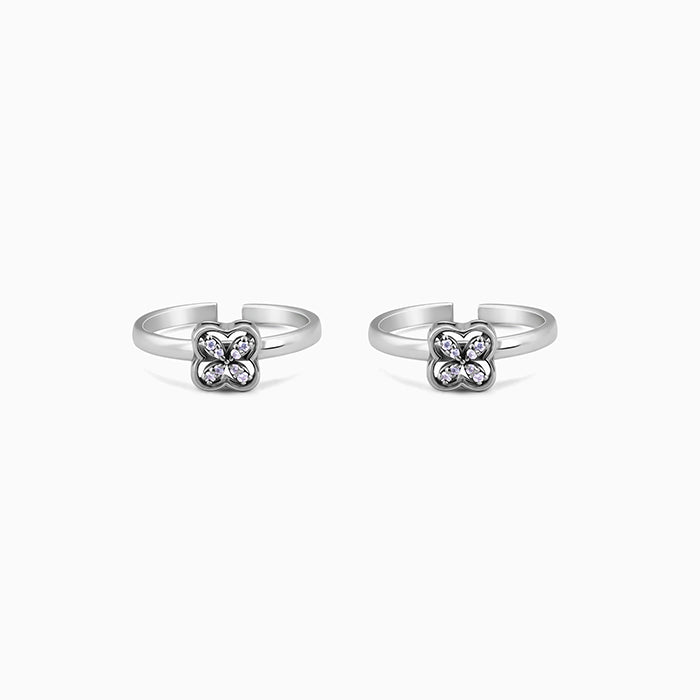 These oxidised silver toe rings for women feature an adjustable design with clover-like motifs studded with zircons.