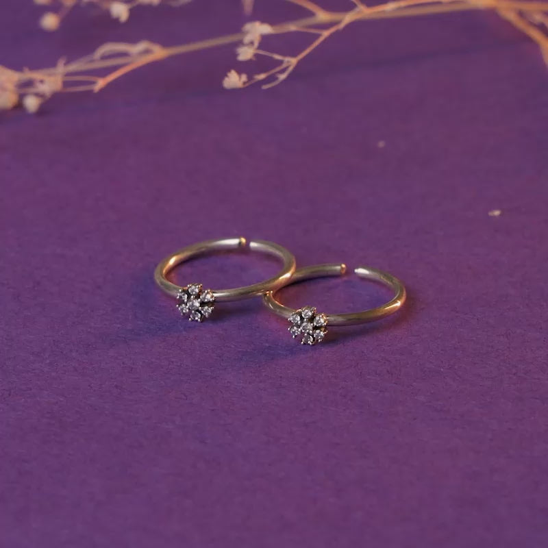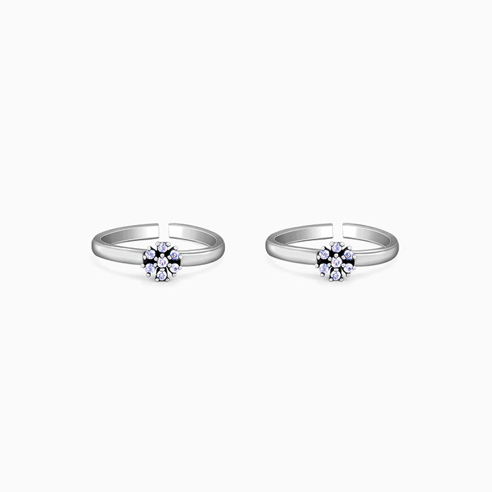 These oxidised silver toe rings for women feature a floral design with zircons.