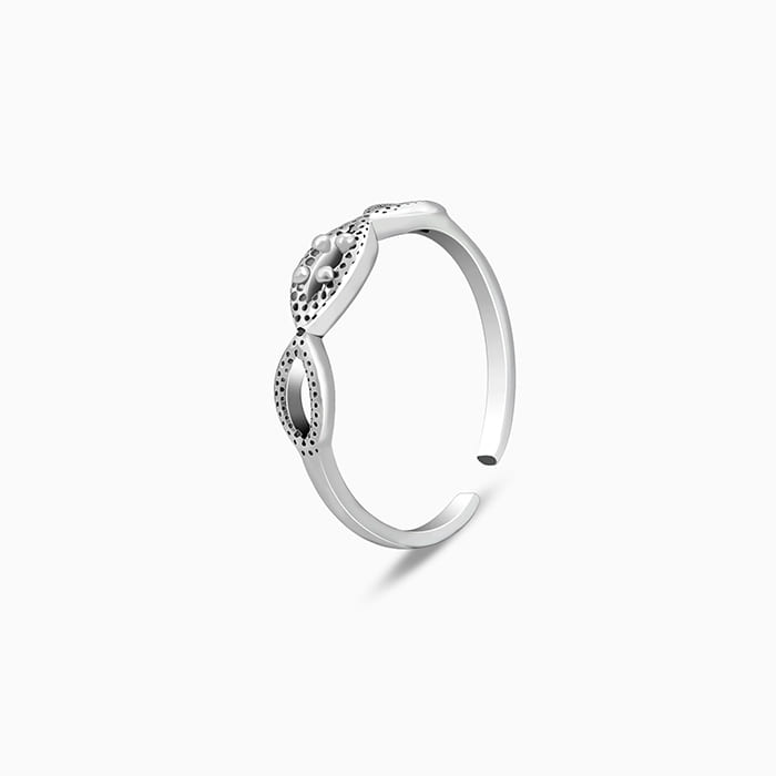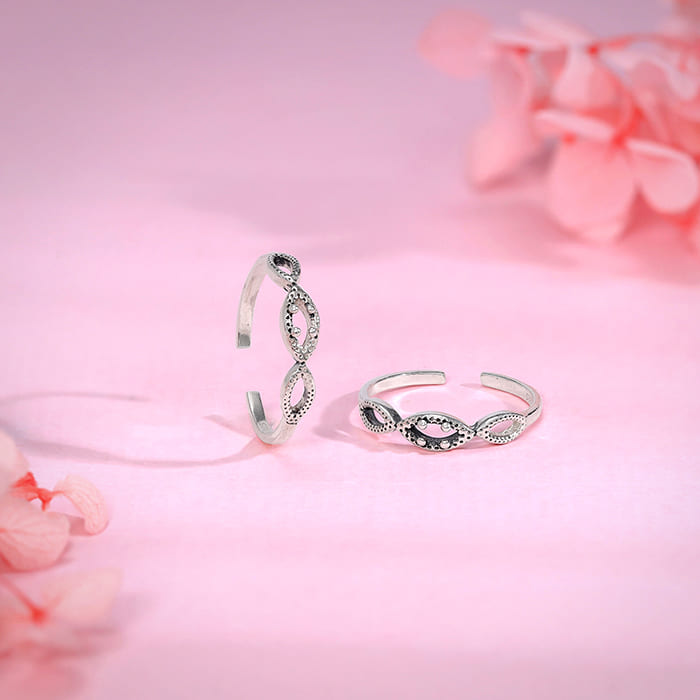 These oxidised silver toe rings for women feature an intricate infinity-inspired design with delicate beadwork accents.