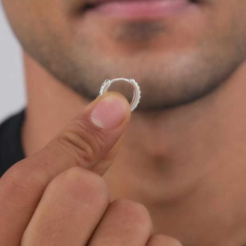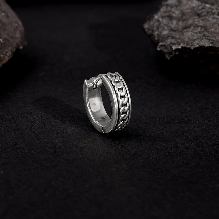 This oxidised silver hoop earring for men features a prominent chain link pattern embossed around its outer edge.