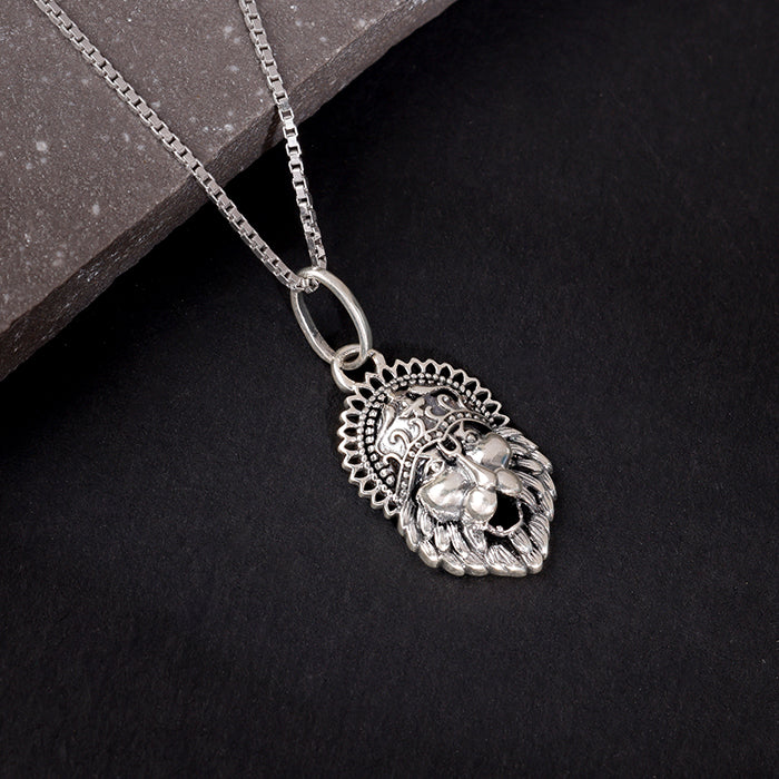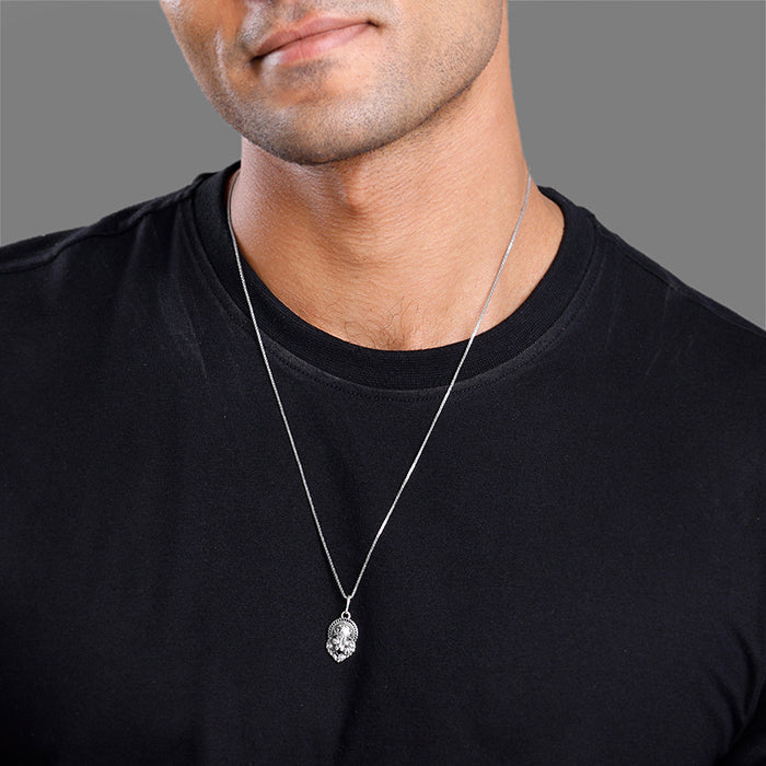 This oxidised silver pendant for men features an intricately carved lion face crowned with regal detailing.