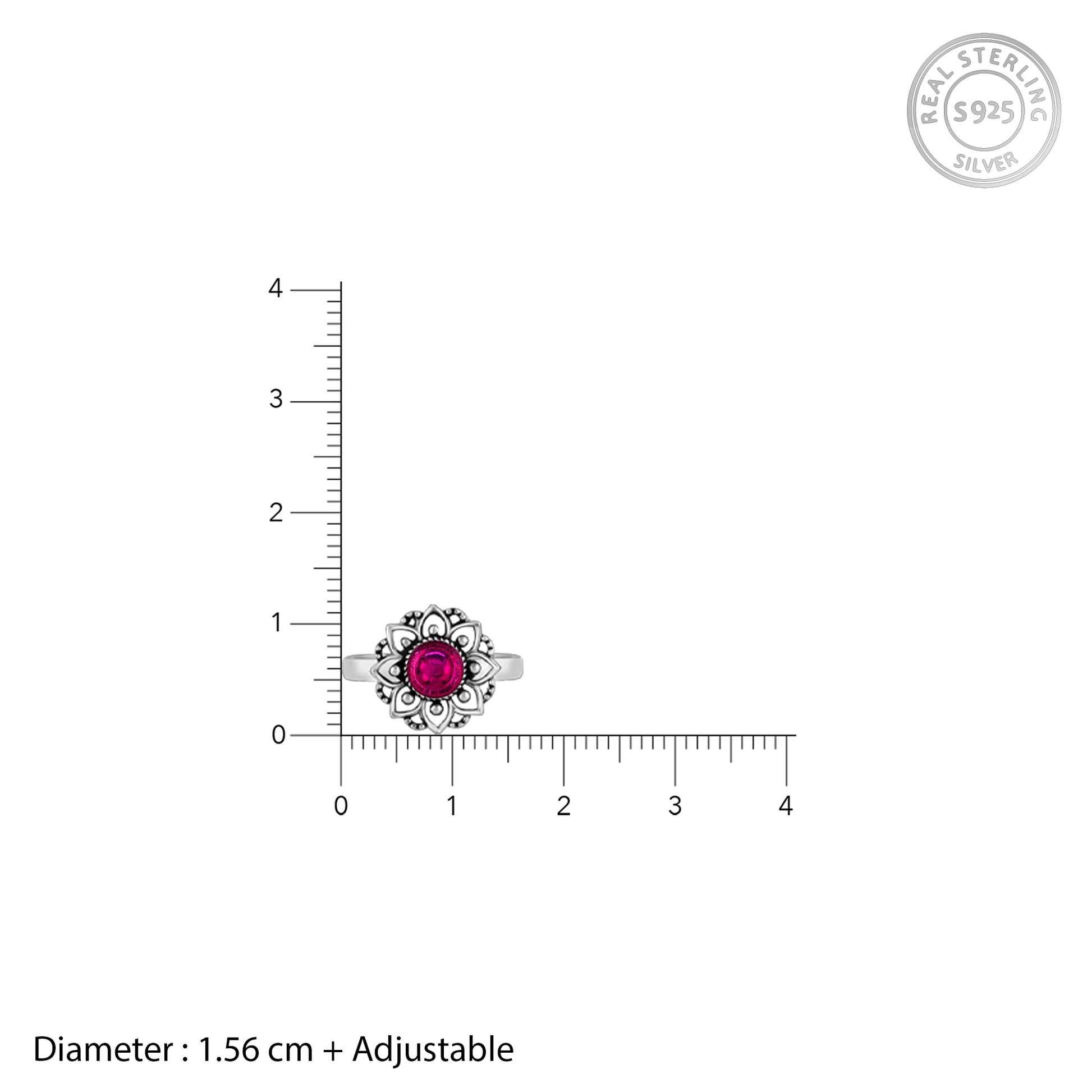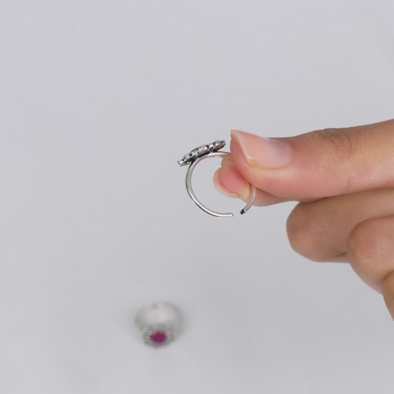 These oxidised toe rings feature a mandala design with a coloured zircon at the centre.