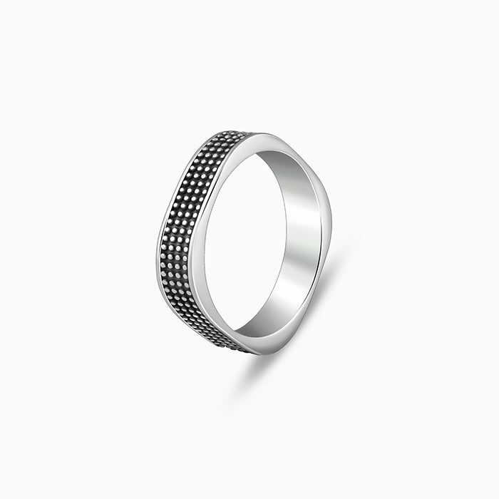 This oxidised silver mens ring features a bold dotted texture. Its square band gives it a sharp, edgy finish.