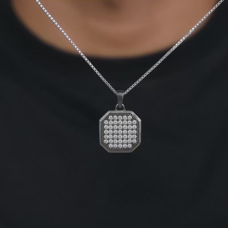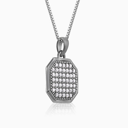 This oxidised silver pendant with box chain for men has a bold, modern design with a geometric shape studded with zircons.