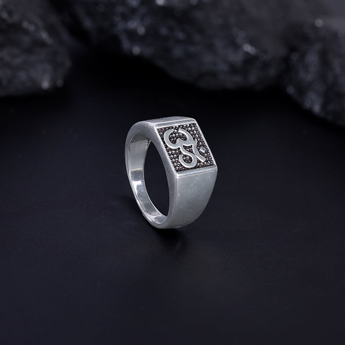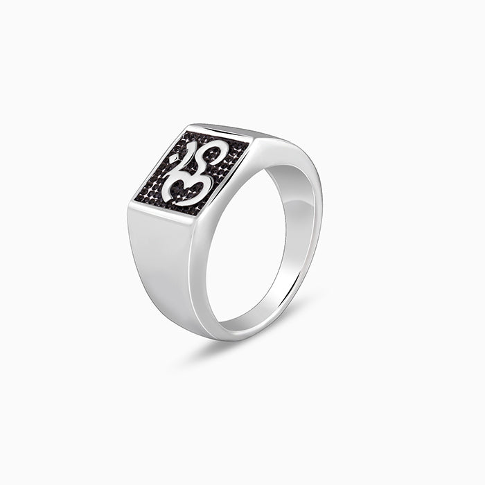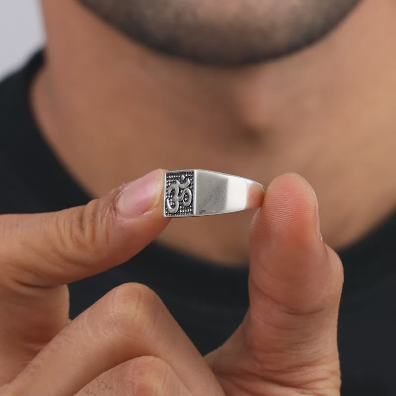 This mens silver ring features a bold square face with a black textured grid pattern, with the centre set by an Om symbol.