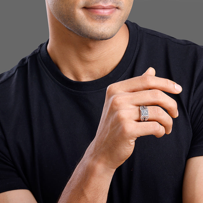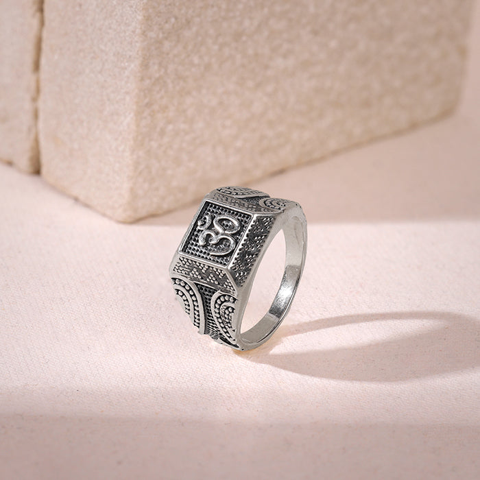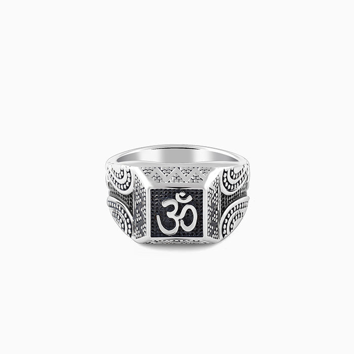 This oxidised silver mens ring features the Om symbol at the centre. Intricate textured patterns surround the symbol.