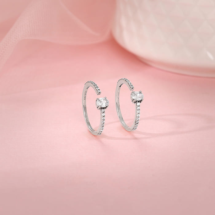 These oxidised silver toe rings for women feature a modern open-ended design, with a shimmering oval-cut zircon on one side and additional zircon stones embedded in the band.