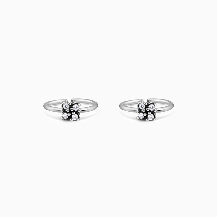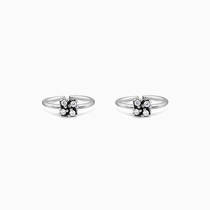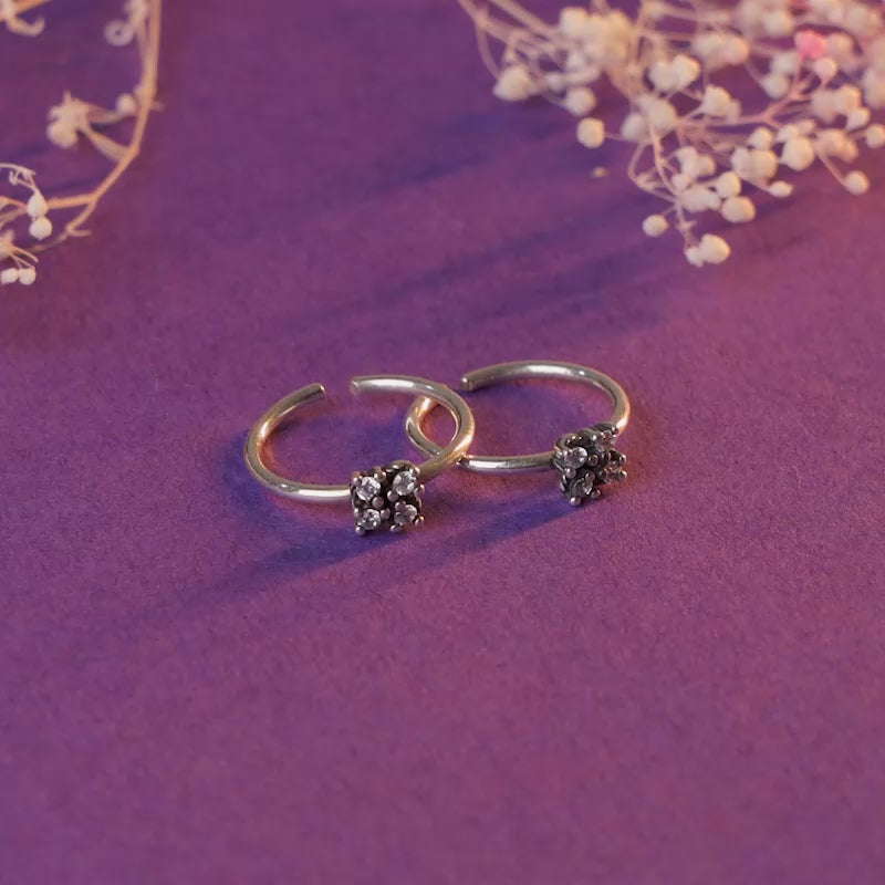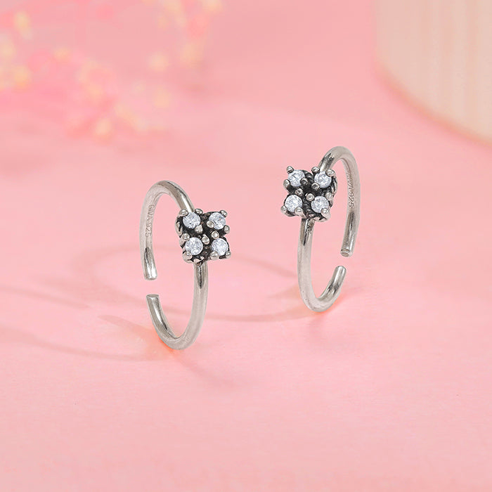 These oxidised silver toe rings for women feature a sleek adjustable band with a floral motif studded with zircons.