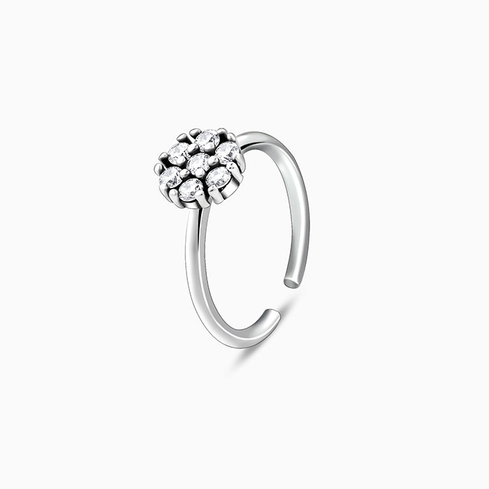 These oxidised silver toe rings for women feature a flower motif studded with zircons.