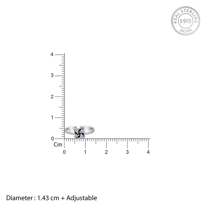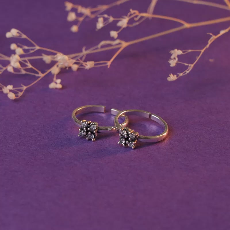 These oxidised silver toe rings for women feature four zircons arranged in a square pattern.