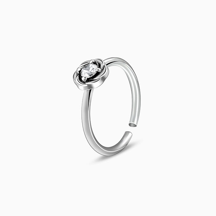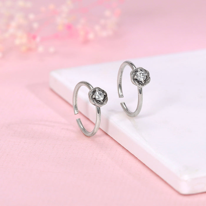 These oxidised silver toe rings for women feature an adjustable design with a floral motif accentuated by a coloured zircon at the centre.