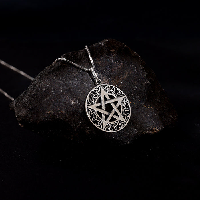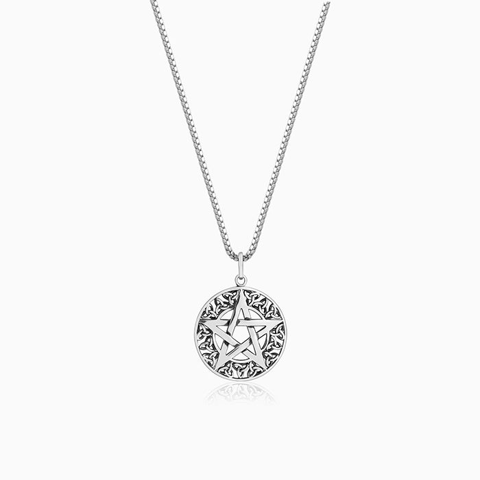 This oxidised silver pendant for men features a bold five-pointed star framed by intricate Celtic knots.