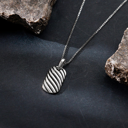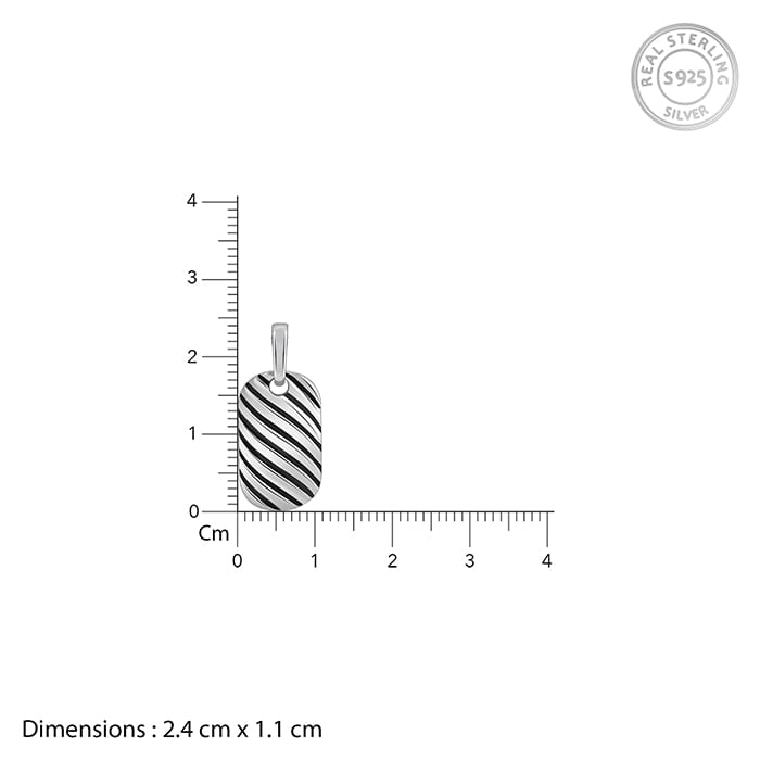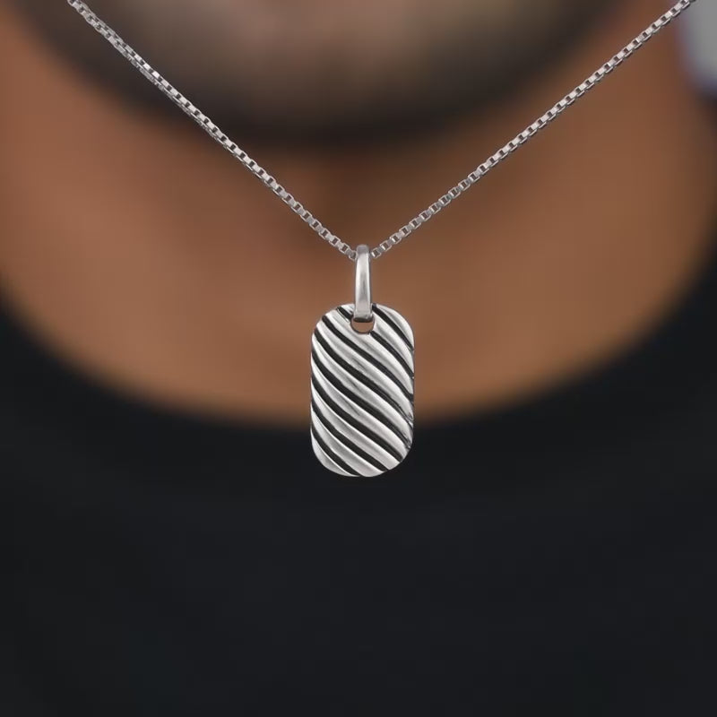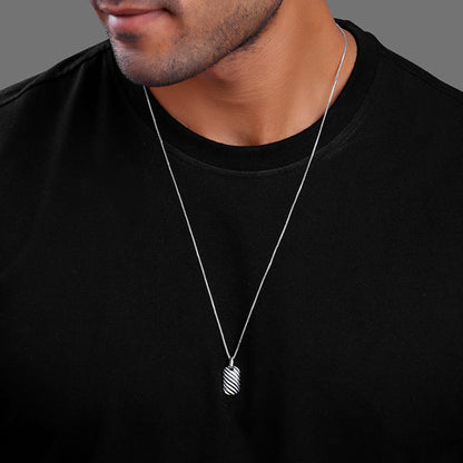 This Oxidised silver pendant for men boasts a sleek rectangular dog tag design, set with a swirling pattern of textured lines that bring a sense of dynamic movement.