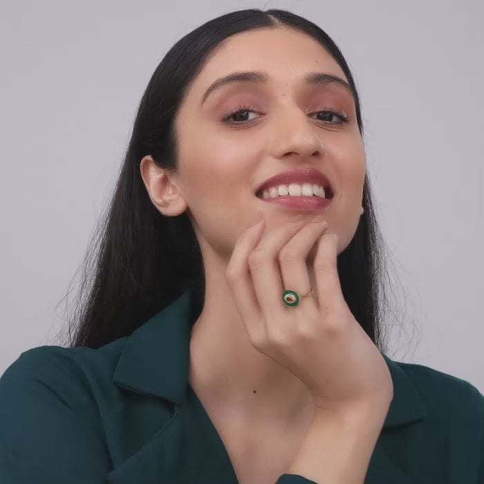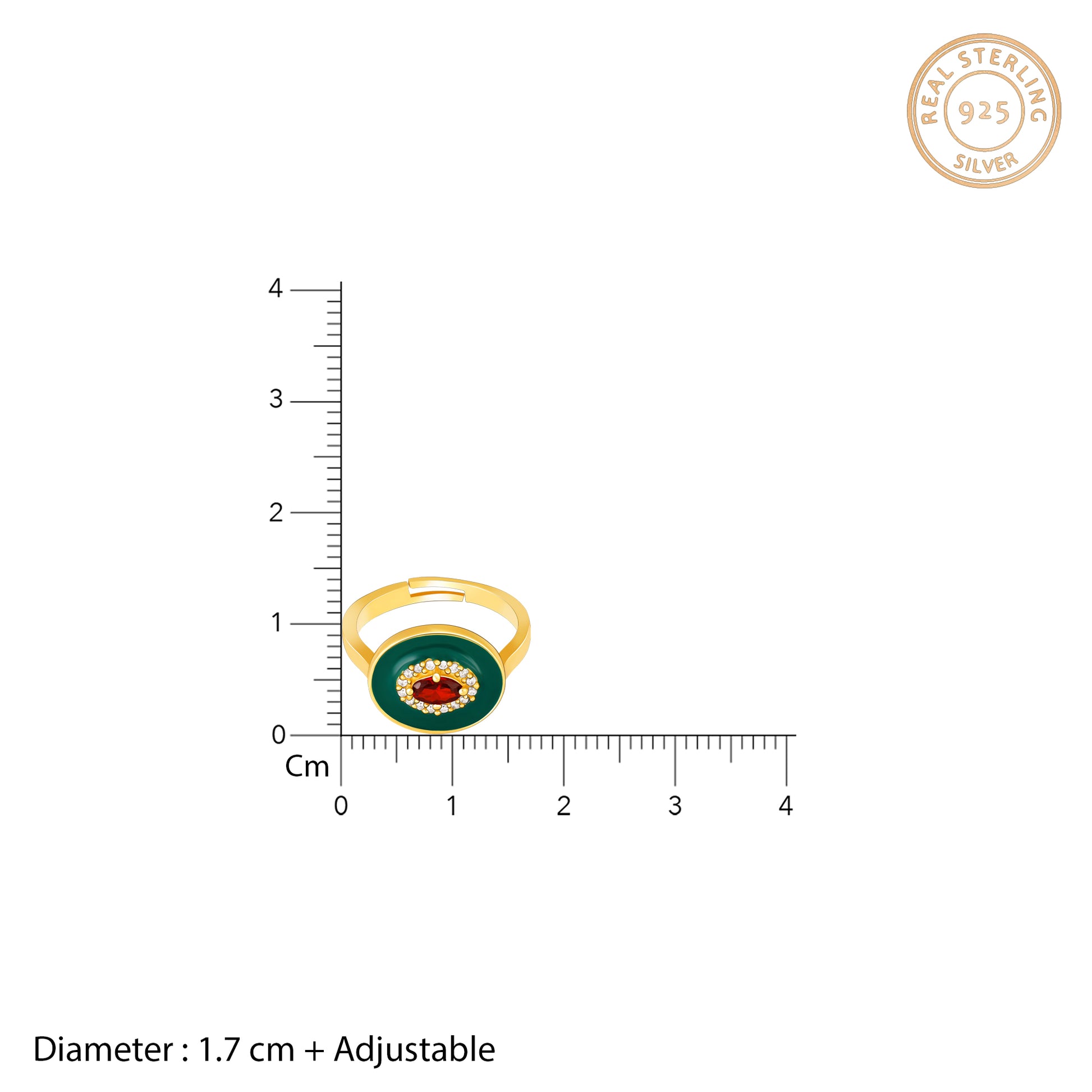 The Golden ring has an oval design with green enamel and red stone in the centre surrounded by zircons.