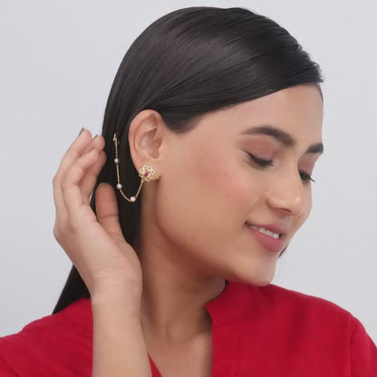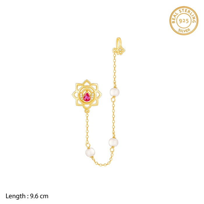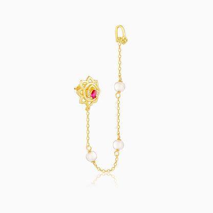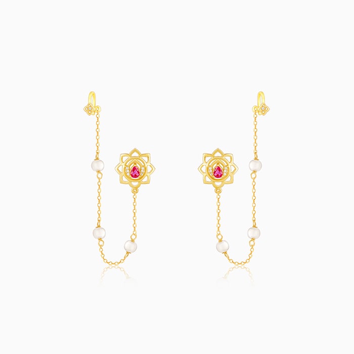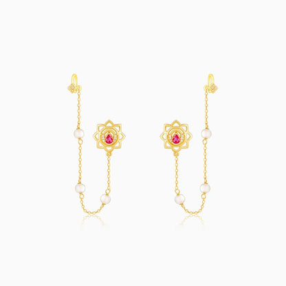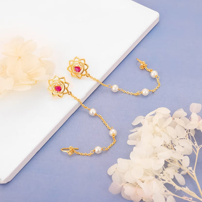 The Golden Earrings have a lotus stud attached to a chain with pearls.