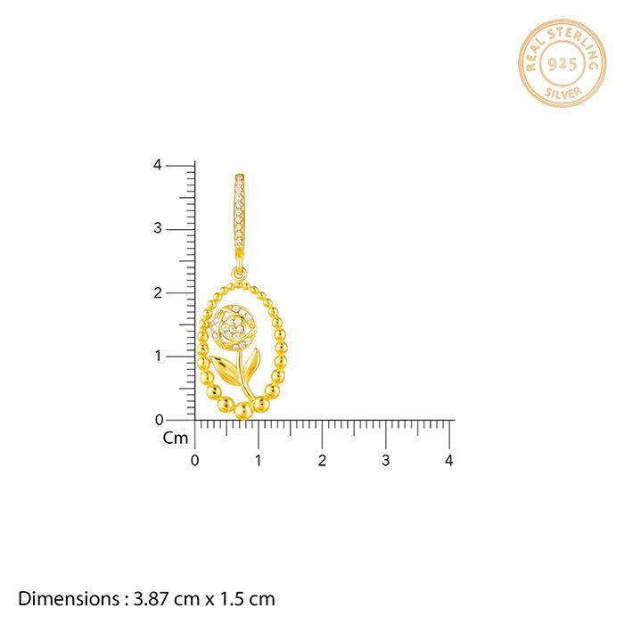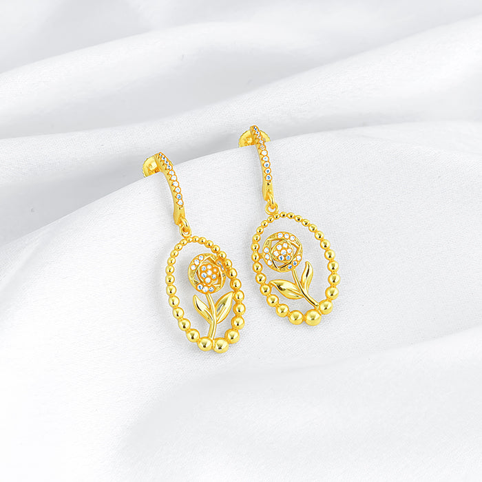 The Golden earrings are huggie-style earrings with an oval design and a rose motif in it studded with zircons.