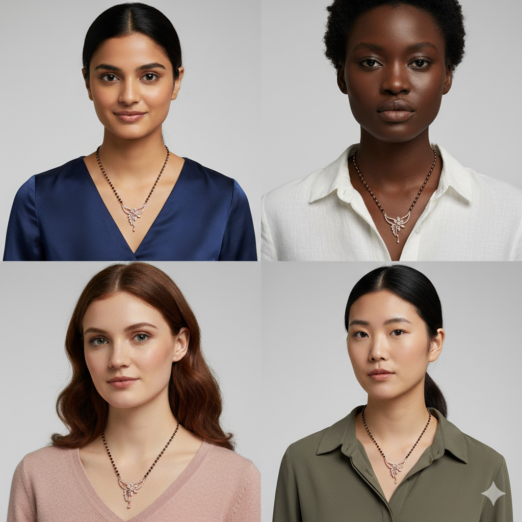 Beautiful piece and glittering stones. Beautiful intricate of this piece . Black mangalsutra chain is good in length .