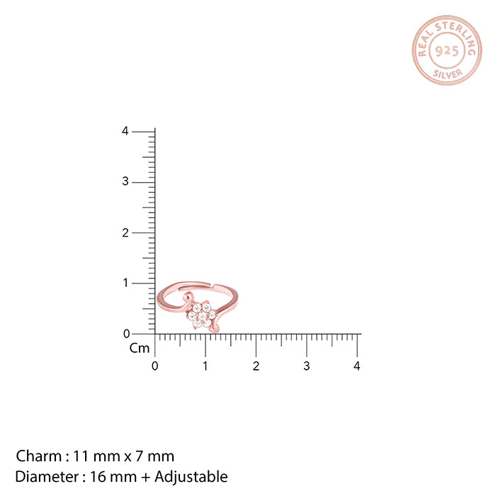 The Rose Gold Snowflake Ring has a snowflake motif worked in with zircons and a curved prong style.