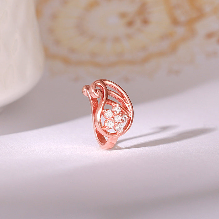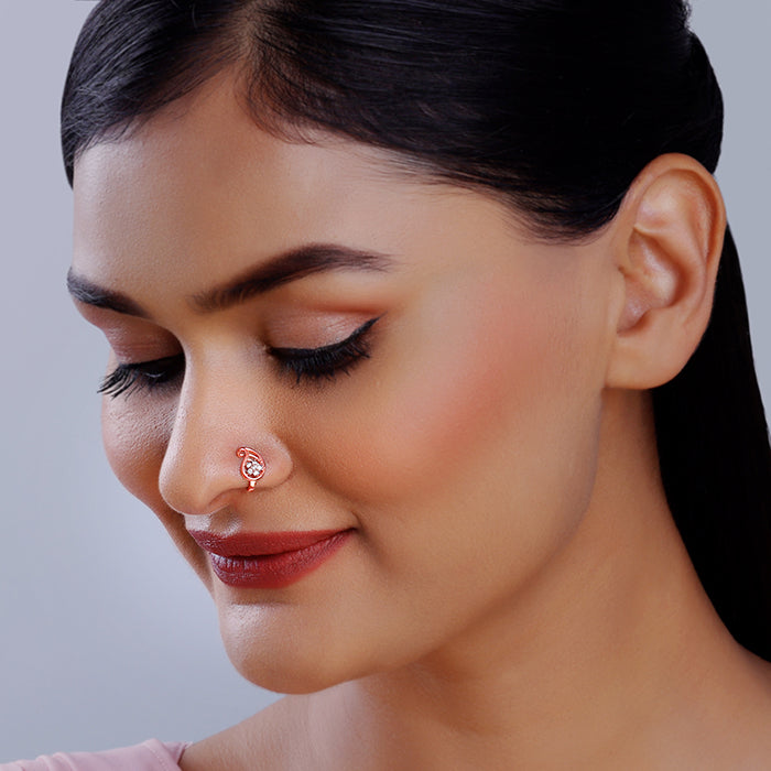 This rose gold nose pin (clip-on) features a paisley design with a flower motif at its centre, studded with zircons. Celebrate the timeless beauty of Indian textiles with GIVA's latest 'Magic of Tradition' collection. Wear and celebrate tradition, anytime.