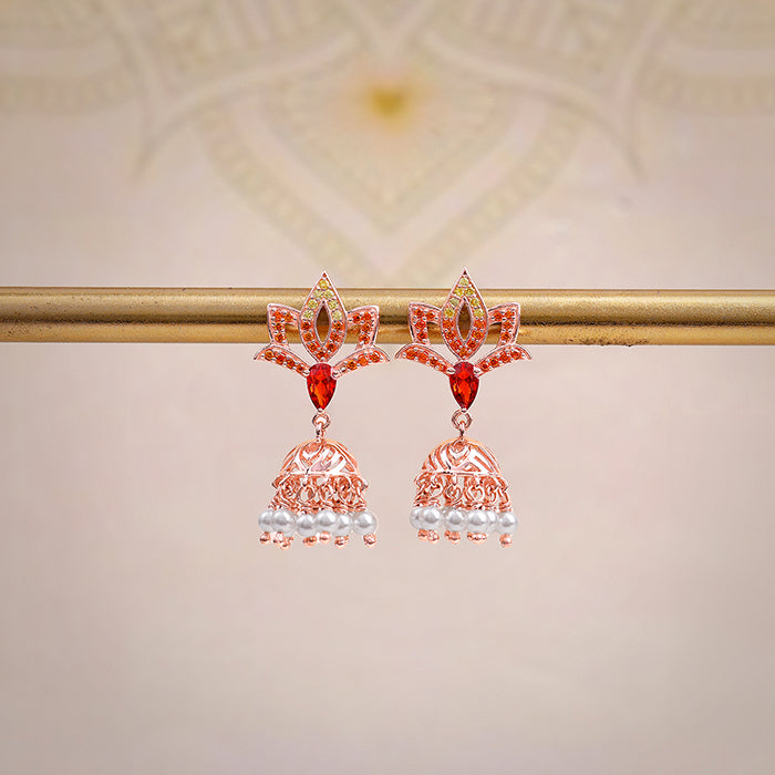 A nod to heritage, a wink to style, this piece strikes the balance effortlessly. These rose gold plated earrings for women feature a coloured-zircon flower motif paired with a dangling jhumka finished with a cluster of pearls.
