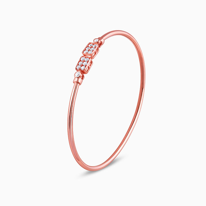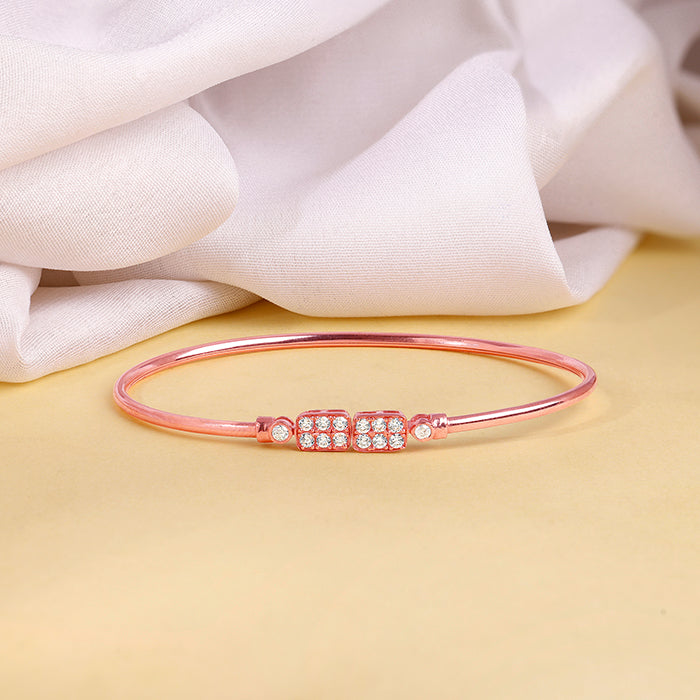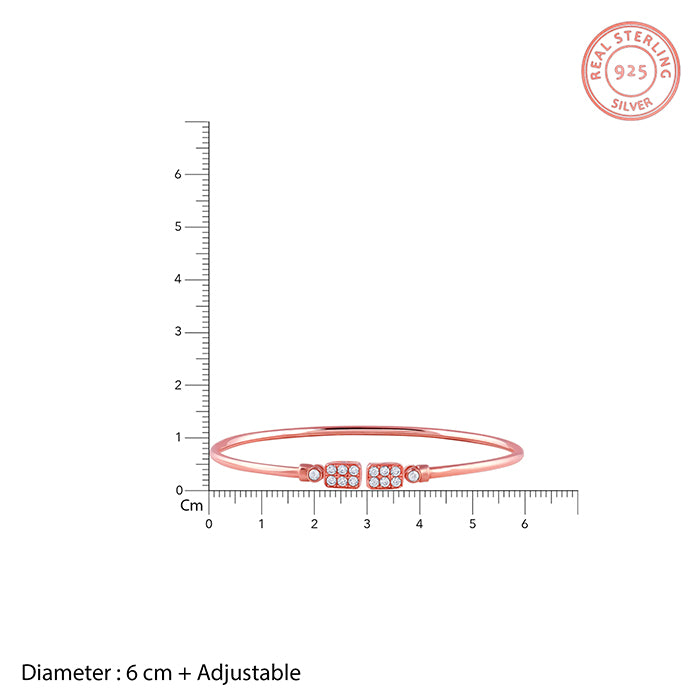 This rose gold plated cuff bracelet for women features an adjustable design with two rectangular shaped bars studded with zircons. Single round zircons are set on either side of the shapes, adding a touch of brilliance.