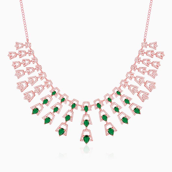 This rose gold plated necklace features an elaborate cascading design. The pattern is made up of sparkling zircons and vivid green teardrop zircons. Each cascading design is framed in a halo of zircons. Presenting our DIVA Collection - a limited edition silver jewellery meant for the women who own every room. Be the star of the party, always.