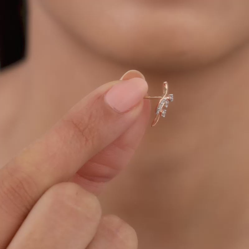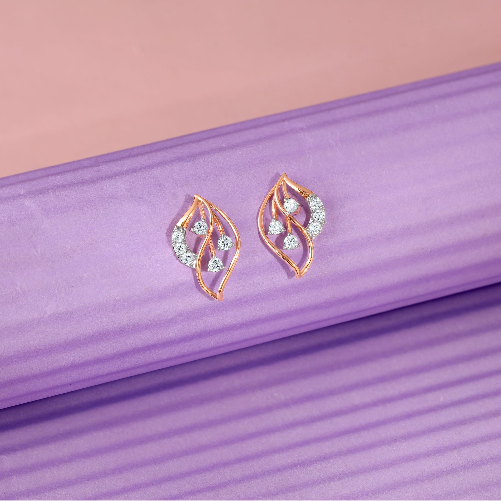 These pure rose gold studs for women feature a unique leaf design. The leaf design is studded with lab grown diamonds.