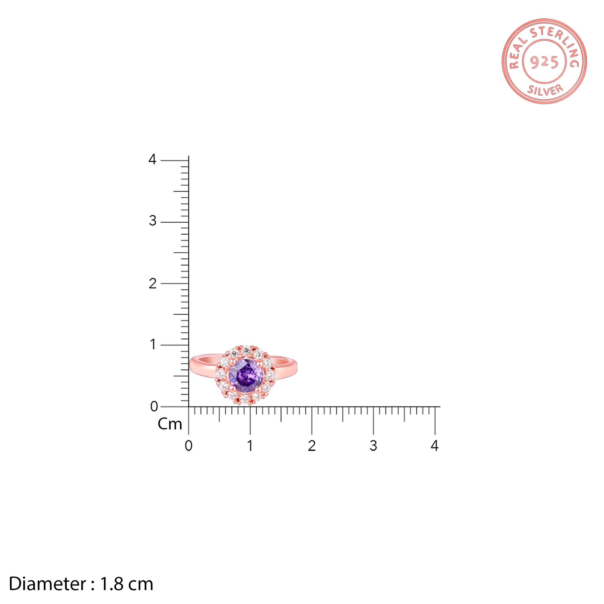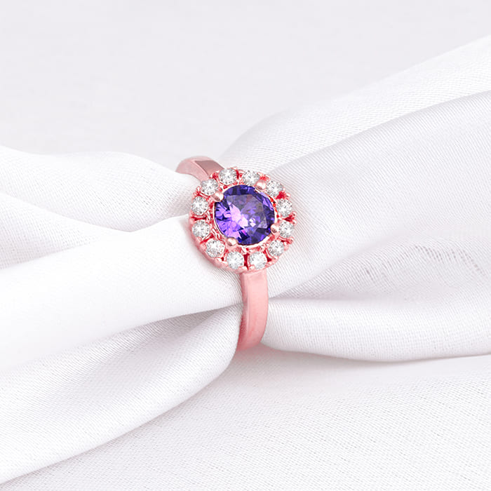 This rose gold ring has a gorgeous circular motif set with zircons, with a purple stone placed at the centre.