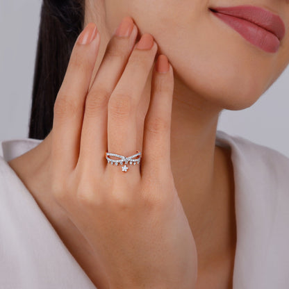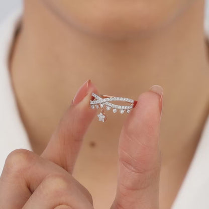 This pure rose gold ring features an infinity motif studded with lab-grown diamonds, with a star-shaped motif adorned with lab-diamonds dangling below.