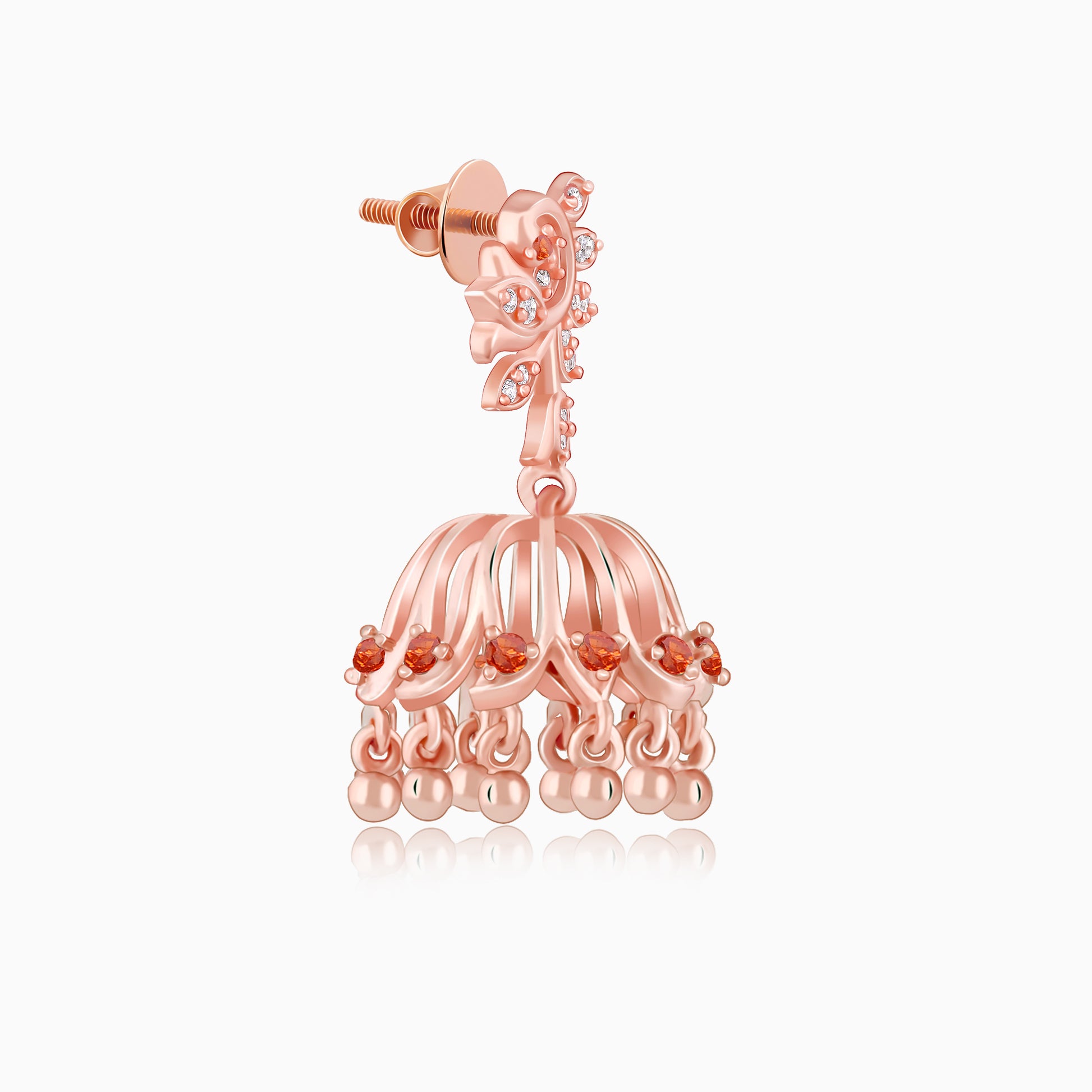 For the woman rewriting traditions on her own terms, these rose gold plated earrings feel like a crown in motion. It features a floral stud set with sparkling zircons, flowing into a jhumki detailed with a row of coloured zircons and dangling beads. Designed in Italy. Inspired by India. Embrace the goddess within with the Shakti Collection by GIVA x Anna Giulia Chicco.