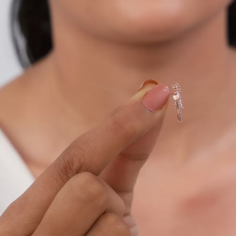 These rose gold earrings for women feature a flower motif at the top. The design cascades into twin semi-circular bands, each encrusted with zircons. Marquise-cut stones add a final touch of glamour to this stunning piece. Presenting our DIVA Collection - a limited edition silver jewellery meant for the women who own every room. Be the star of the party, always.