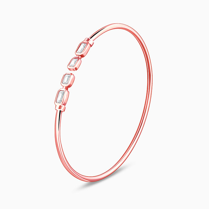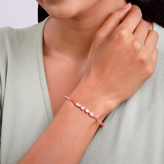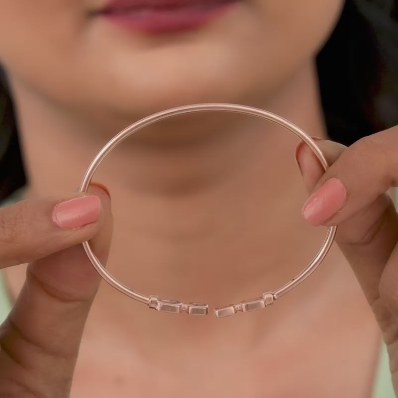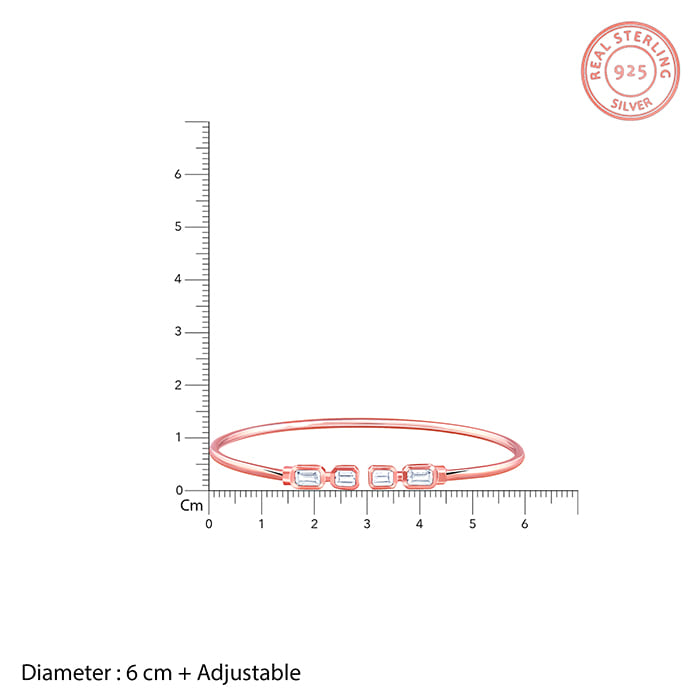This rose gold plated cuff bracelet for women features an adjustable design with two evenly spaced rectangular zircon accents on both ends.