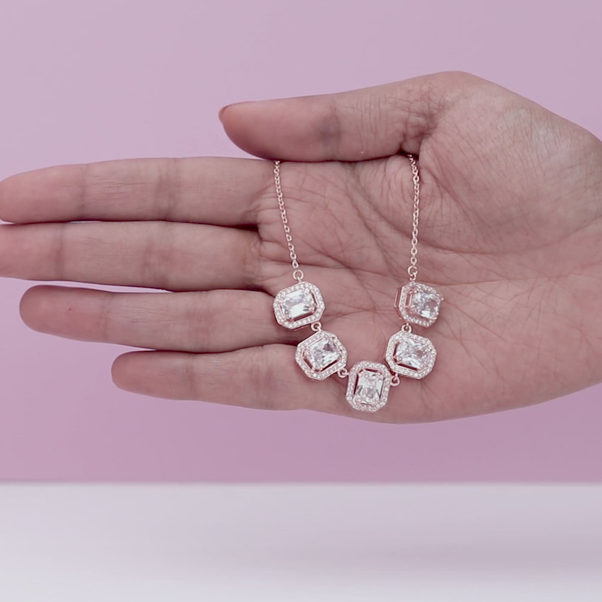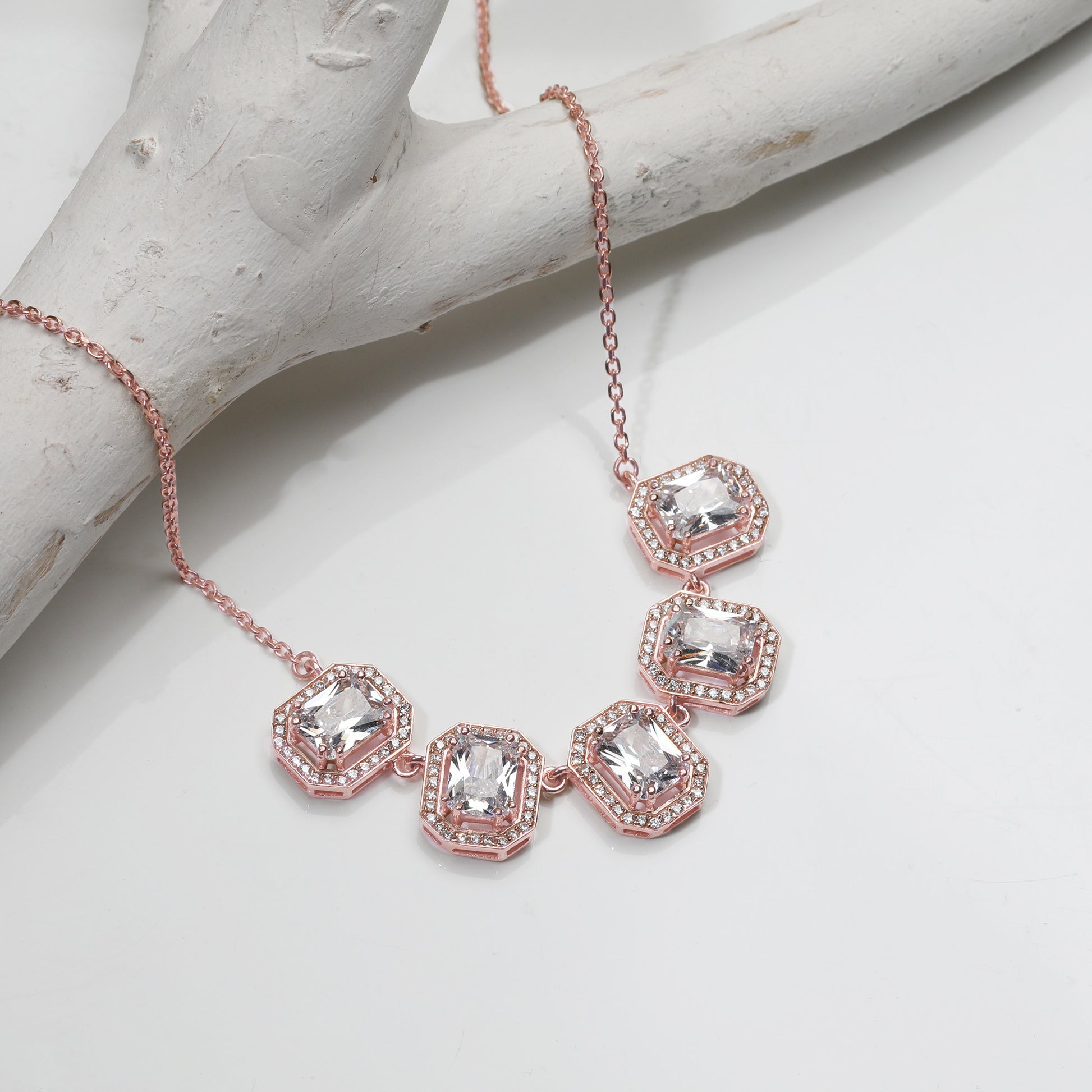 The Rose Gold Baguette Bunch Necklace is handcrafted with love, just for YOU. The baguette shaped bold zircons settled in the rose gold frame is nothing less than classic. The surrounding little zircons only adds to the beauty.